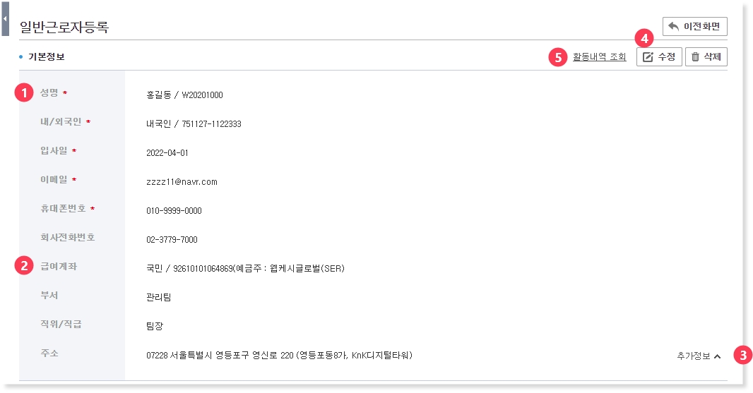 ③ 추가정보를 클릭하여 부서, 직위/직급, 주소 등 해당 직원에 대한 정보를 추가로 등록할 수 있습니다.