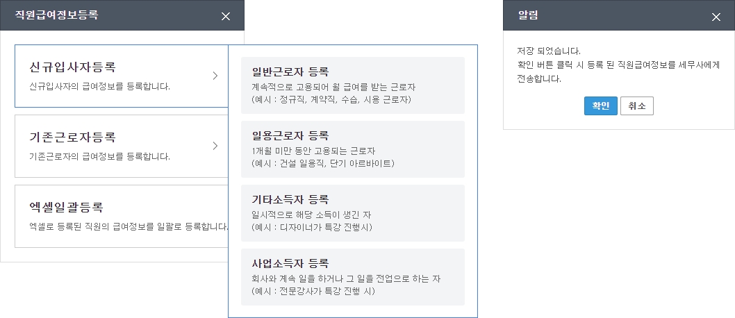 알림팝업에서 확인 버튼 클릭 시 수임세무사에게 등록된 직원 급여정보가 전송됩니다.