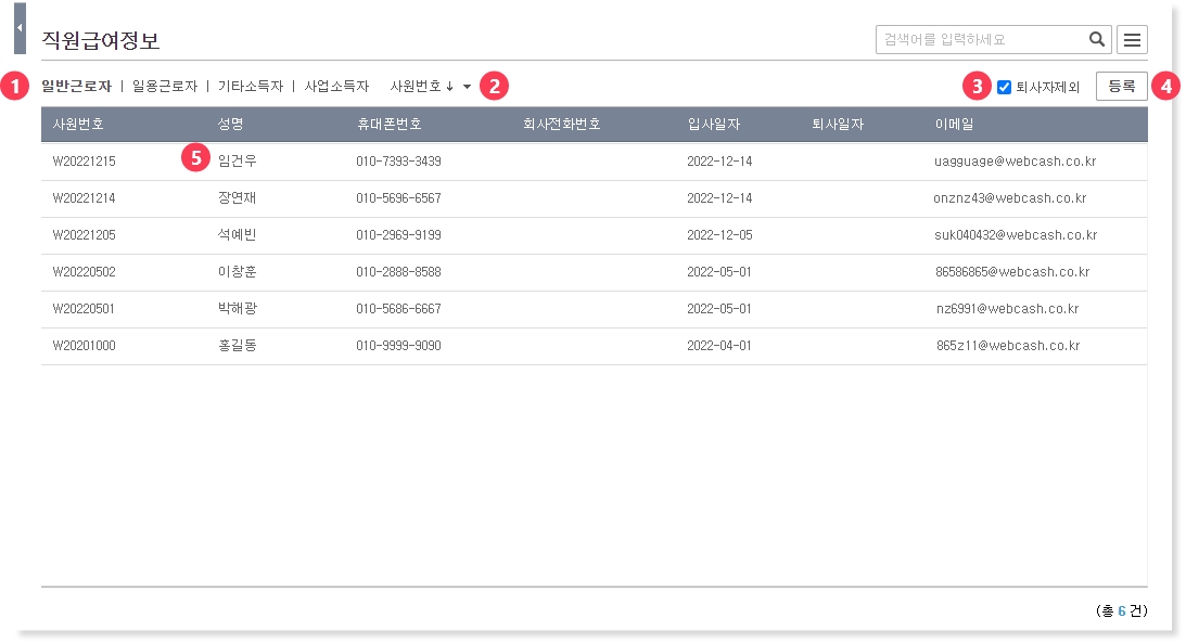 ① 직원으로 등록된 일반근로자, 일용근로자, 기타소득자, 사업소득자을 조회할 수 있습니다.