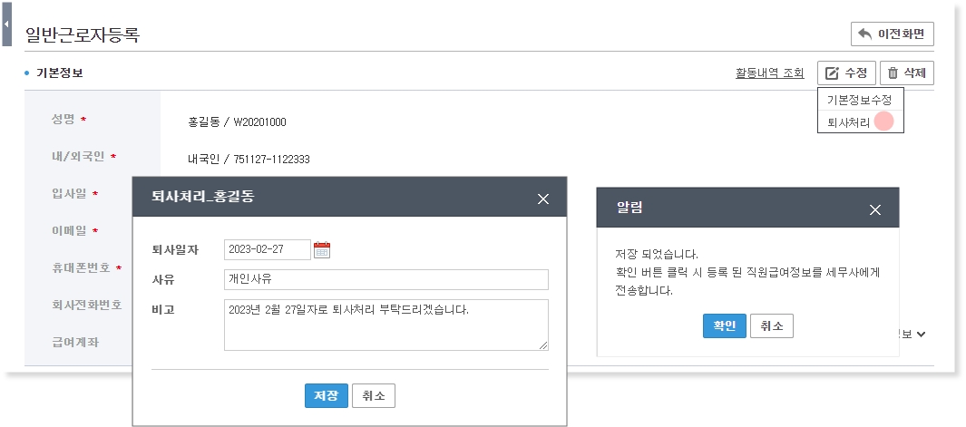 수정버튼을 클릭하여 퇴사일자와 사유를 등록 후 저장 시 알림팝업이 실행 됩니다.