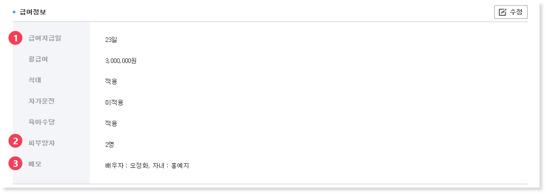① 급여지급일, 월급여 등 직원의 기본적인 급여정보를 등록할 수 있습니다.