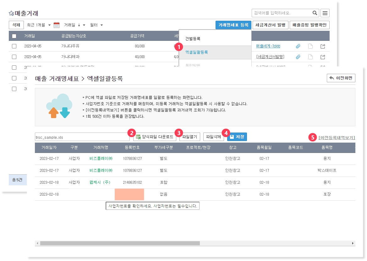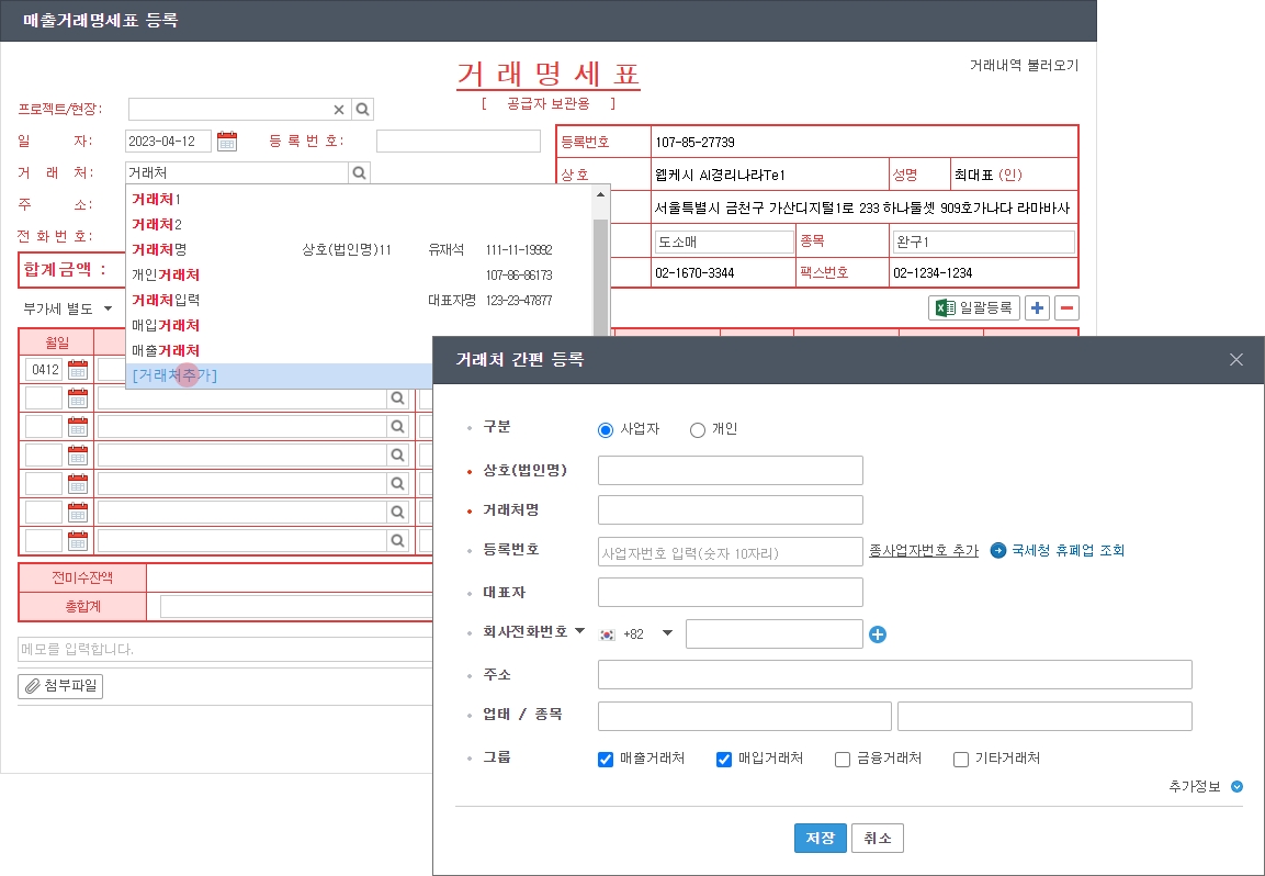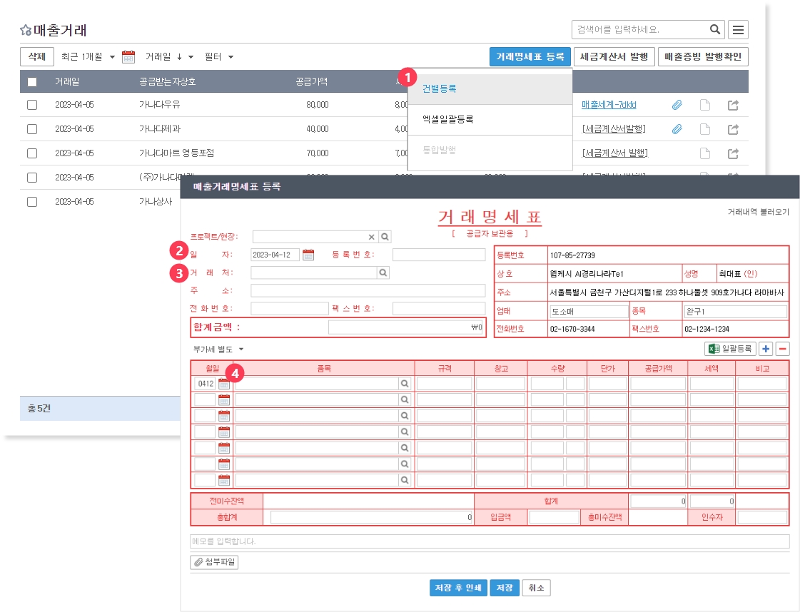 매출거래명세표를 건별로 등록하거나 일괄로 엑셀파일을 업로드하여 등록할 수 있습니다.
