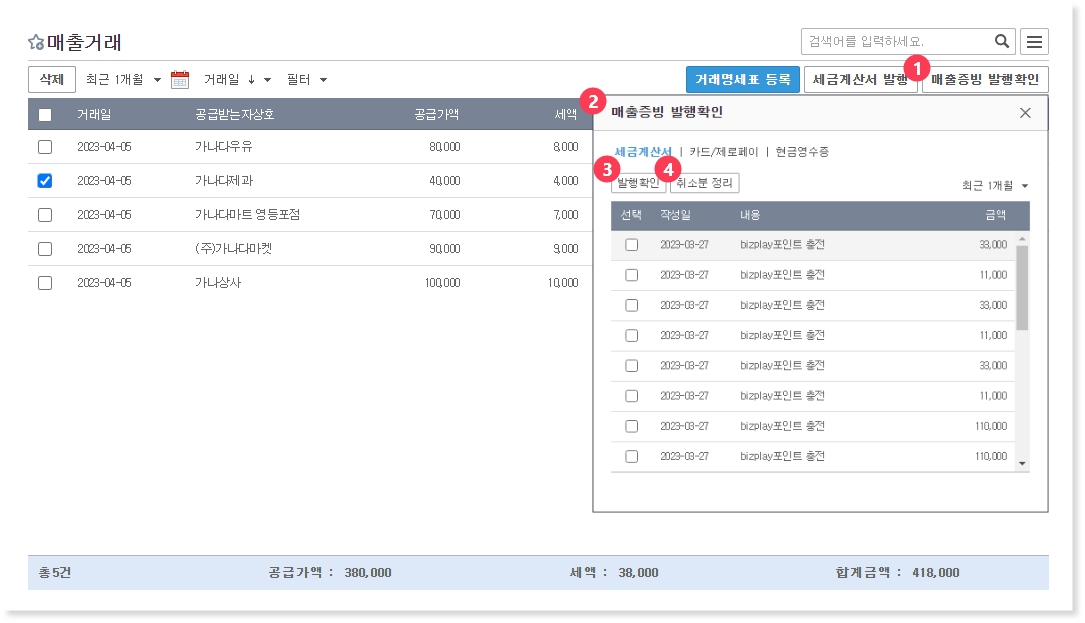 ② 거래명세표를 선택하면 해당하는 거래처의 세금계산서 및 카드/제로페이, 현금영수증 내역을 조회할 수 있습니다.