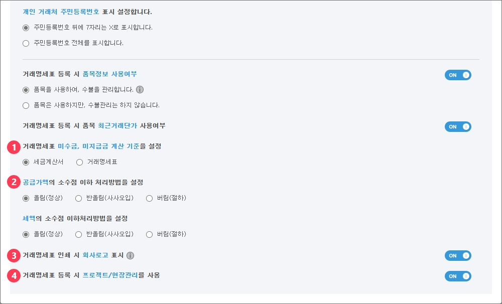 ② 세액 및 공급가의 소수점 이하 처리방법을 설정할 수 있습니다.