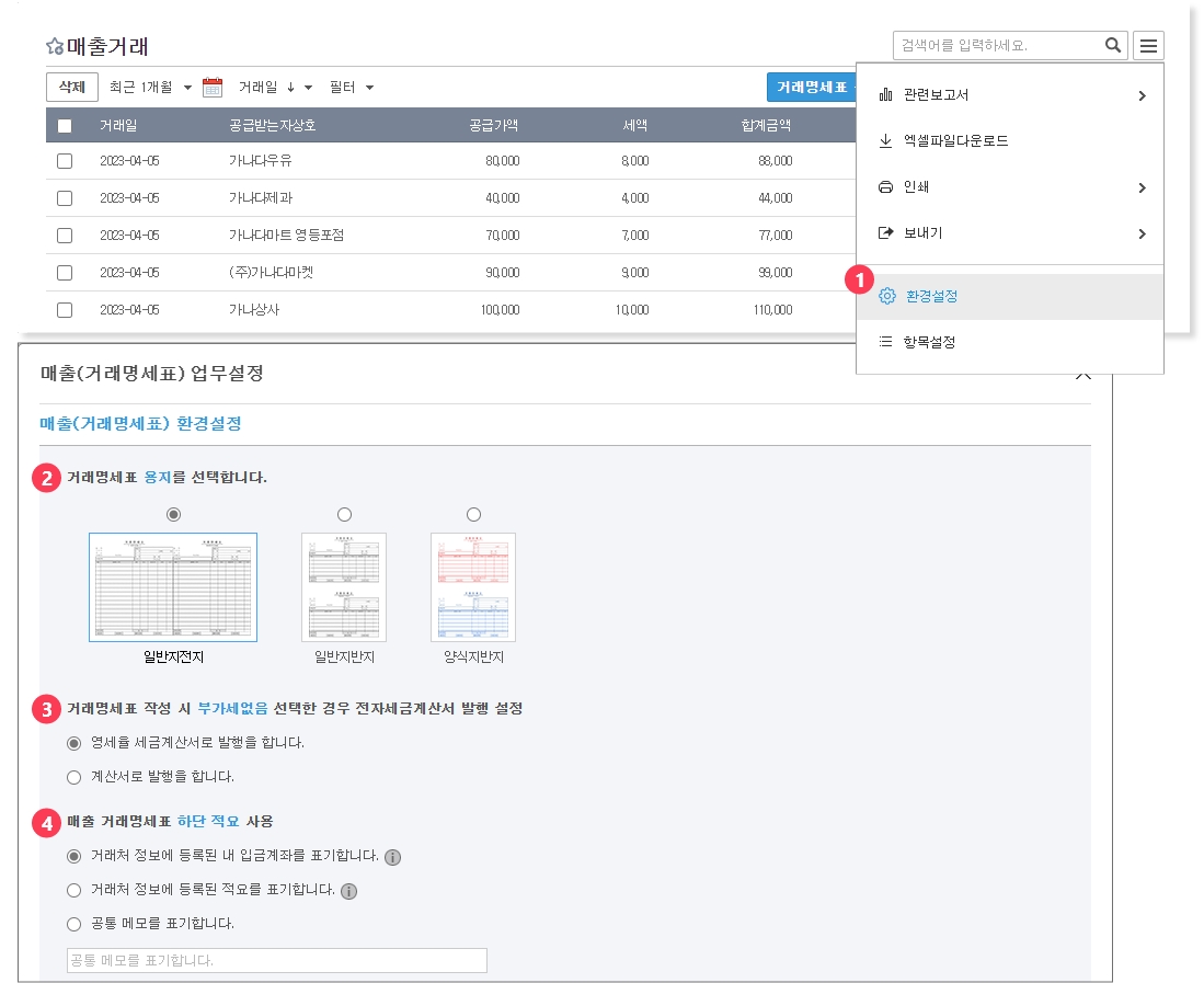 우리 회사의 업무환경에 맞게 거래명세표 양식을 변경하여 사용할 수 있습니다. 거래명세표 용지 및 하단 적요, 전미수 표시 등 매출거래명세표 등록 시 표기되는 내용에 대한 옵션을 선택할 수 있습니다.
