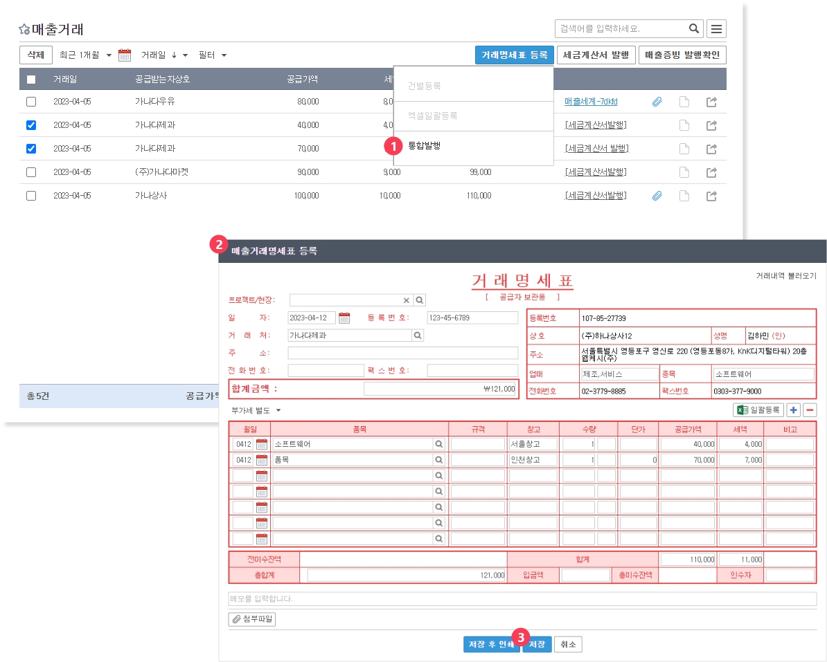 등록되어있는 거래명세표를 다건 선택하여 하나의 거래명세표로 통합 발행할 수 있습니다.