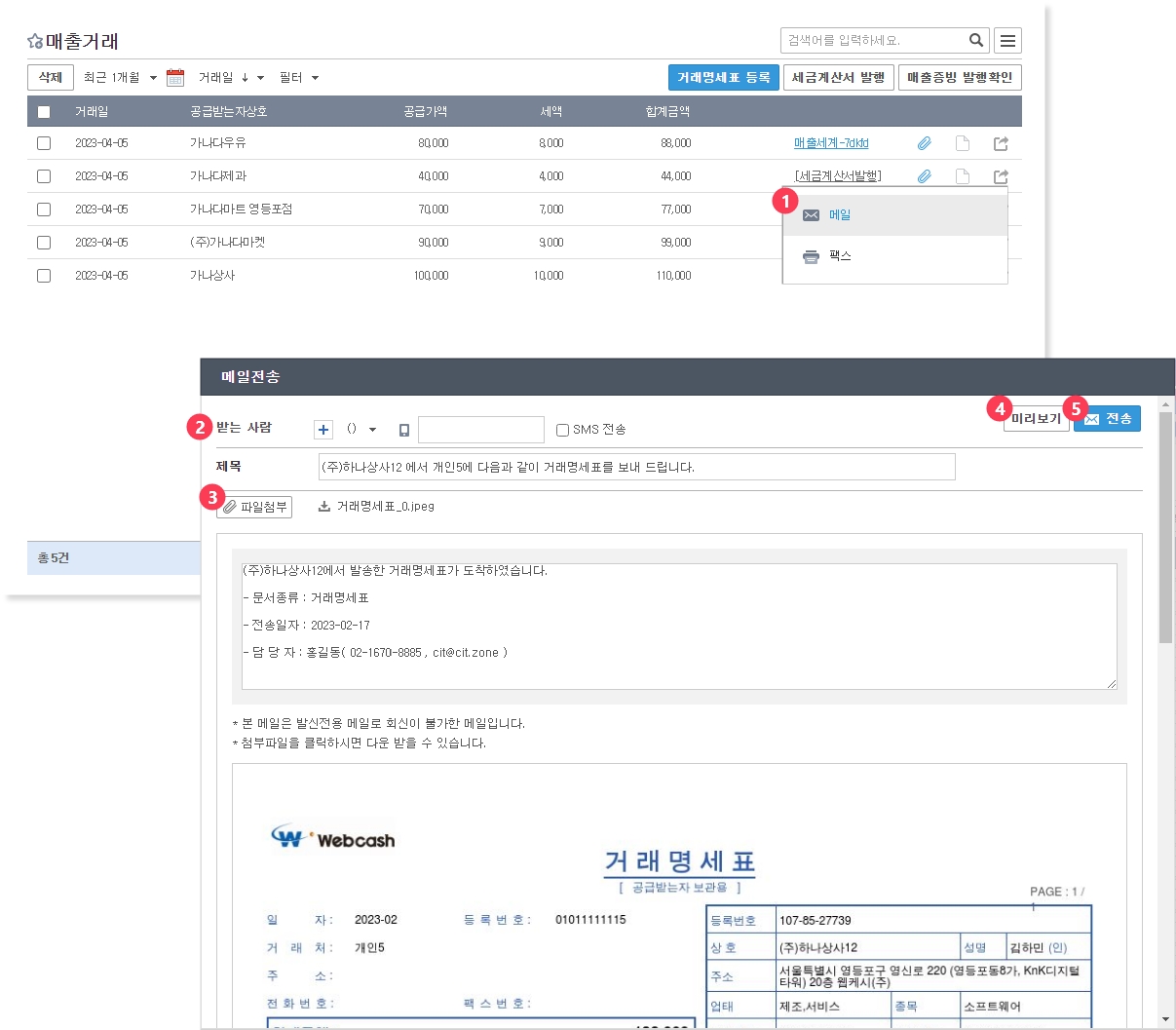 매출거래명세표 및 증빙서류 메일 또는 팩스로 거래처에 전송하기