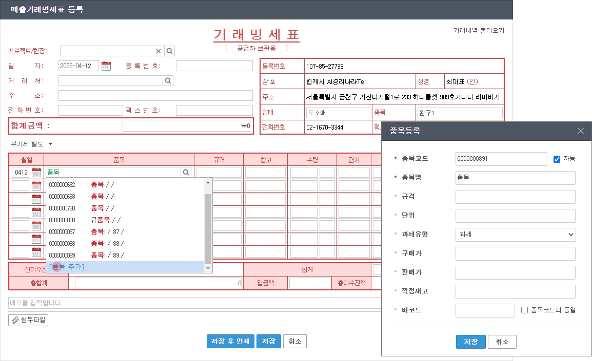② 매출거래명세표 창이 생성되면 거래명세표의 수정 및 추가가 가능합니다.