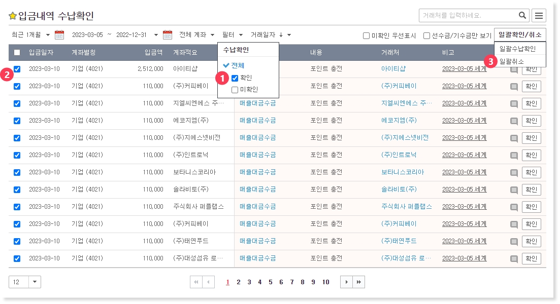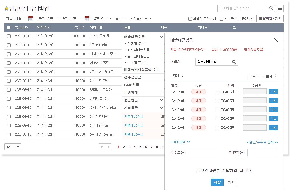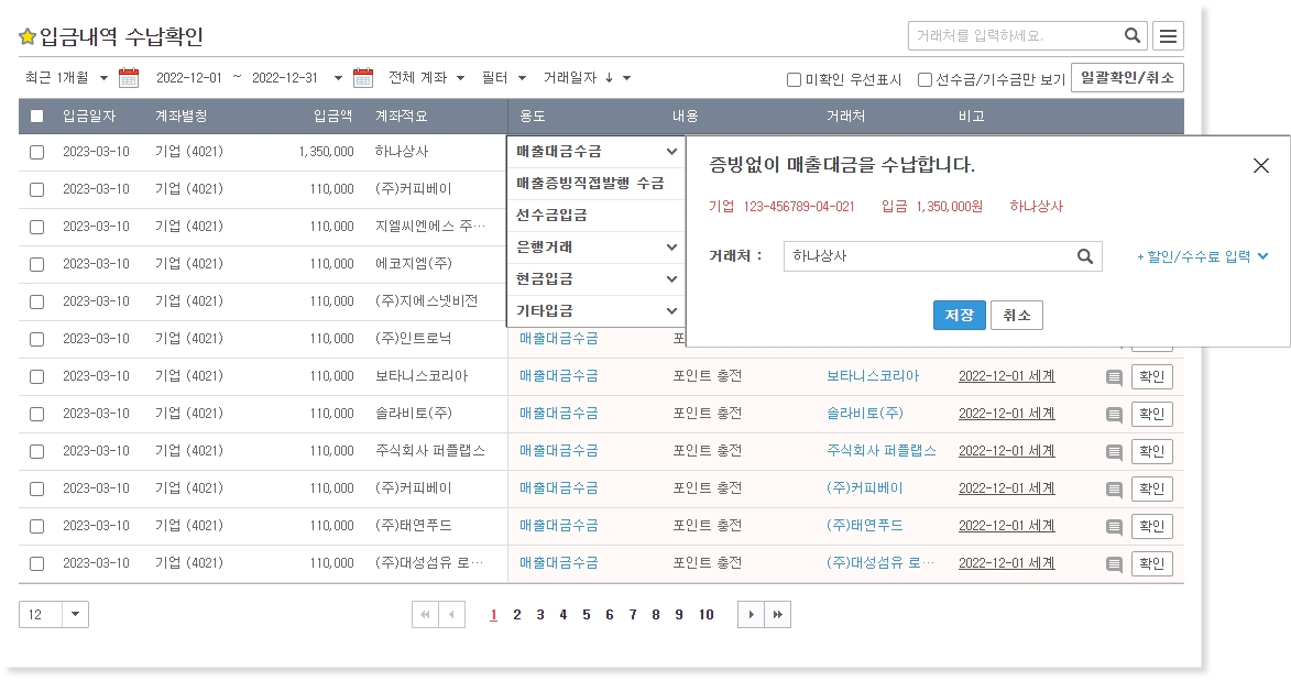 거래처로 부터 회수된 매출 입금 내역을 거래처명으로 간편하게 수납처리하여 미수금현황을 관리할 수 있습니다.