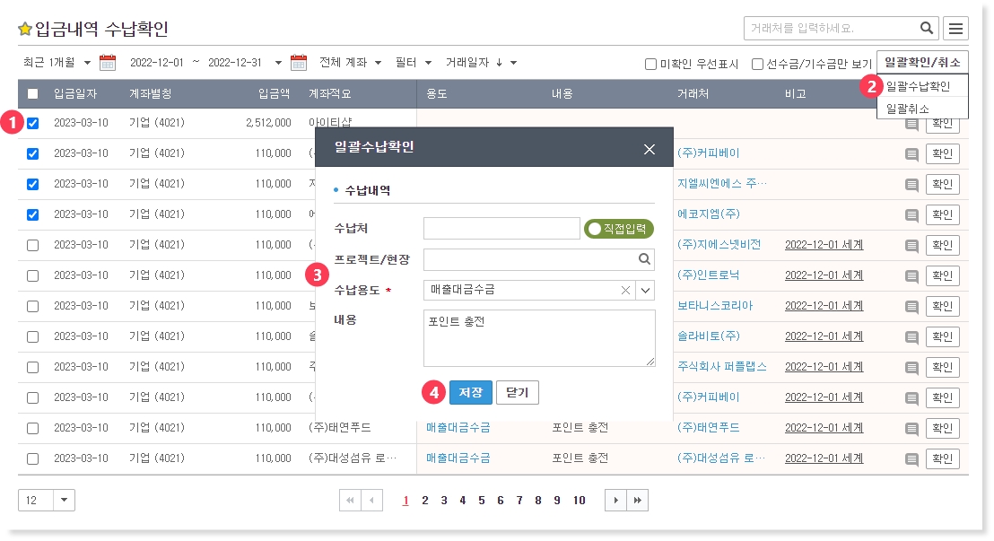 ① 일괄수납처리할 입금 내역을 선택합니다.