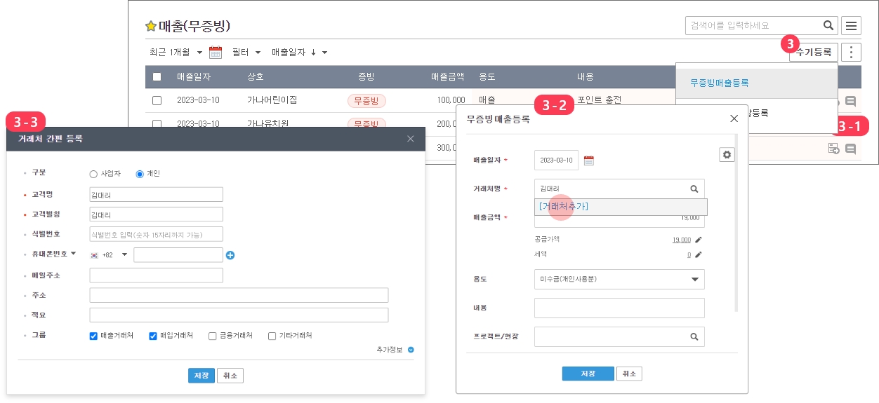 무증빙매출 등록 시 실수로 법인카드를 사용한 직원을 거래처로 추가하여 입력합니다.