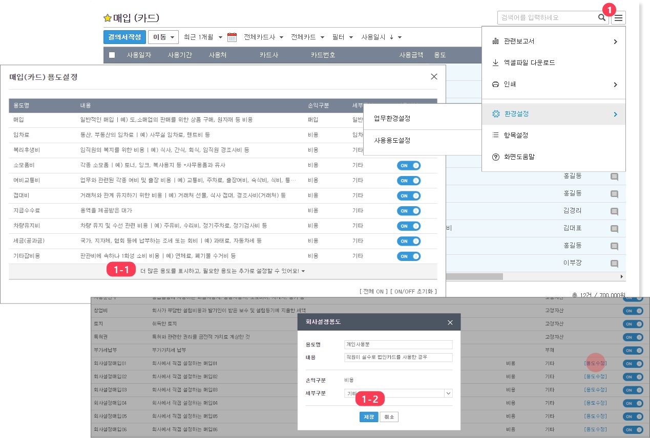 ① 매입(카드) 메뉴의 환경설정 〉 사용용도설정 에서 용도 추가 설정을 클릭합니다.
