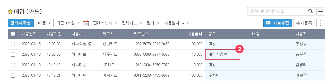 ② 실수로 사용한 카드 매입내역의 용도를 개인사용분 으로 입력합니다.