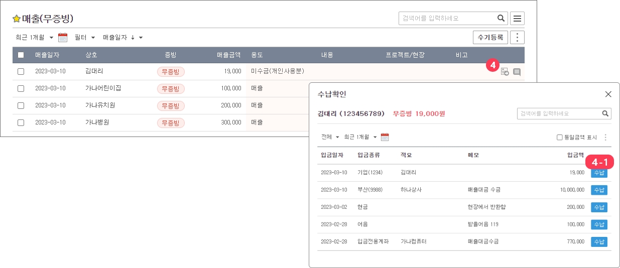 ④ 직원의 입금 내역이 확인되면, 무증빙매출의 수납확인을 통해 미수금 등록분을 수납처리 합니다.