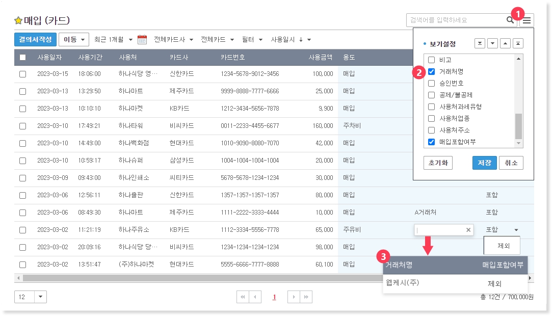 ③ 세금계산서를 수취했으나 카드로 매입대금을 결제한 내역의 매입포함여부를 '제외'로 변경하고, 세금계산서의 매입 거래처명을 입력합니다.